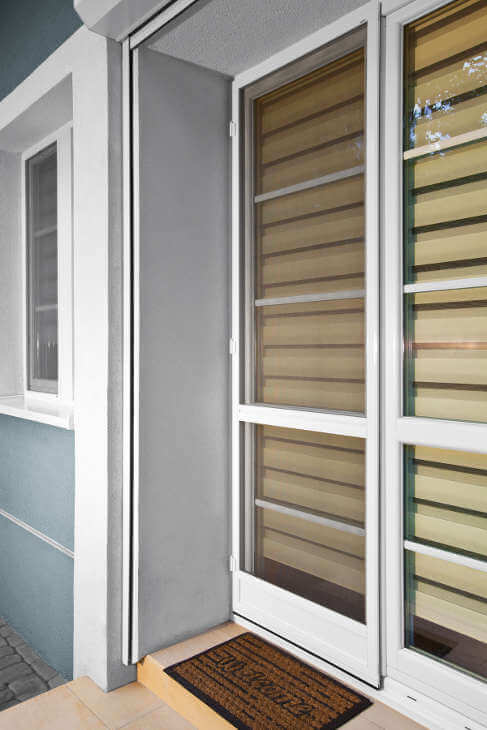 Moskitiera na drzwi otwierana na wymiar to idealny system do drzwi balkonowych montowany za pomocą zawiasów do fasady budynku lub futryny drzwiowej. Posiada rączkę do otwierania, magnesy trzymające siatkę w pozycji zamkniętej oraz uszczelkę szczotkową, która jeszcze lepiej zabezpiecza pomieszczenie przed owadami i zanieczyszczeniami z zewnątrz.